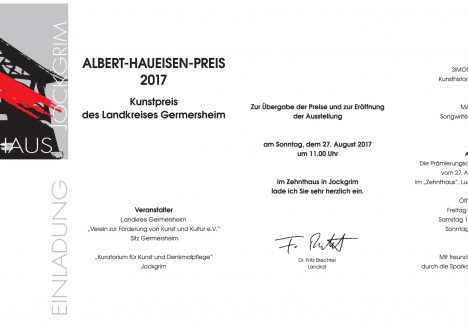 Der Kunstpreis des Landkreises Germersheim, der Albert-Haueisen-Preis 2017, wird spartenübergreifend alle zwei Jahre ausgeschrieben. 281 Bewerbungen waren es in diesem Jahr und 40 Kolleg+inn+en wurden für die Endausscheidung von der Jury ausgewählt. Ich freue mich sehr darüber, nun bereits zum dritten Mal bei der Ausstellung zum Albert-Haueisen-Kunstpreis mit dabei zu sein. Die Eröffnung der Ausstellung…